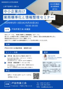 戸田市商工会では、業務の見える化と整理をテーマに、自社ですぐに実践できる「業務標準化と情報整理セミナー」を開催いたします。 この機会に、無理なく進められる業務改善の一歩を踏み出してみませんか?